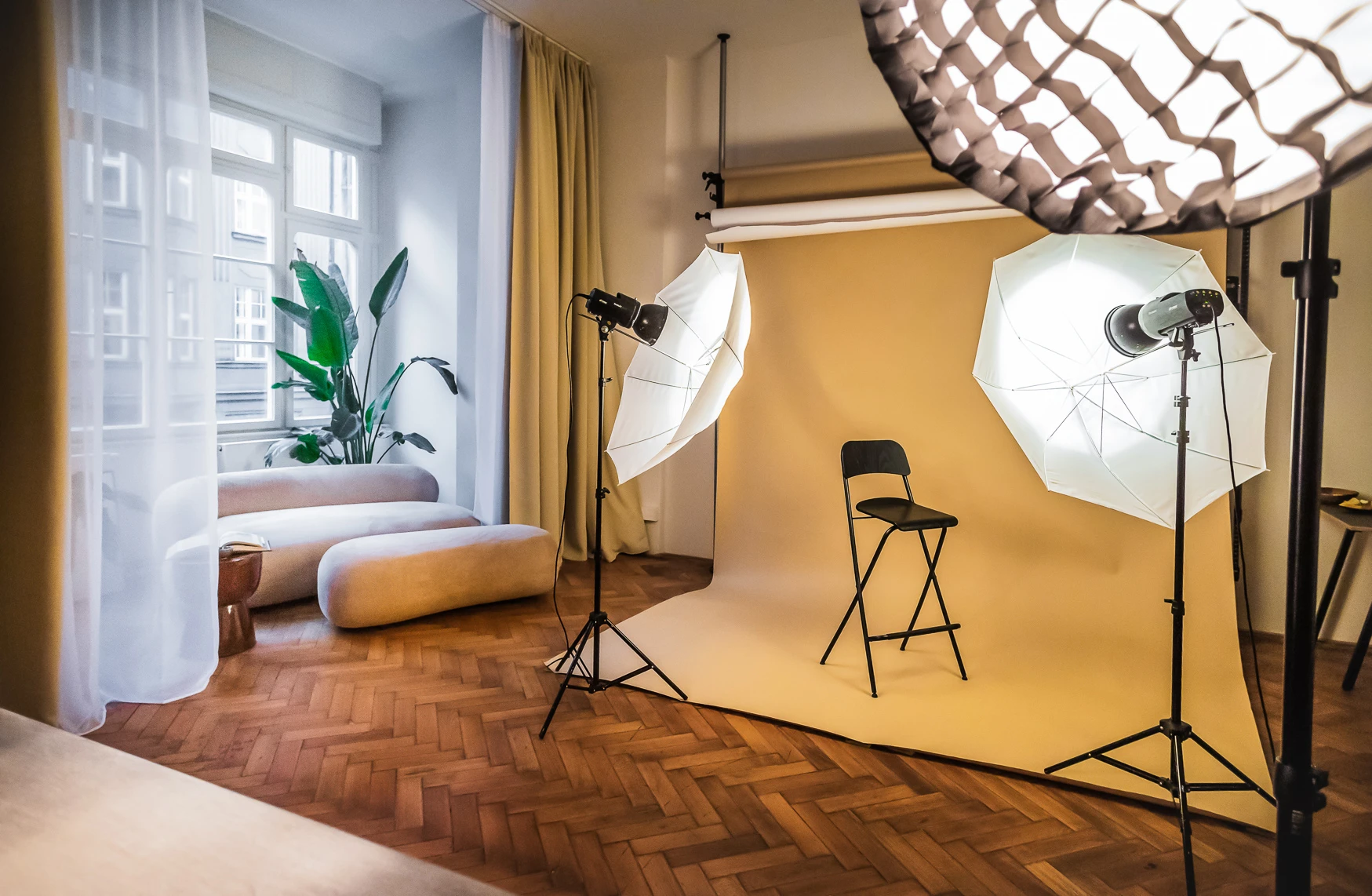 Profesionální studiové osvětlení, fotoplátno a difuzní plátno.